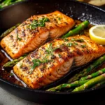 Garnish and Serve: Remove the skillet from heat, garnish the salmon with fresh parsley and black sesame seeds, and serve immediately with lemon wedges on the side for an extra zing.